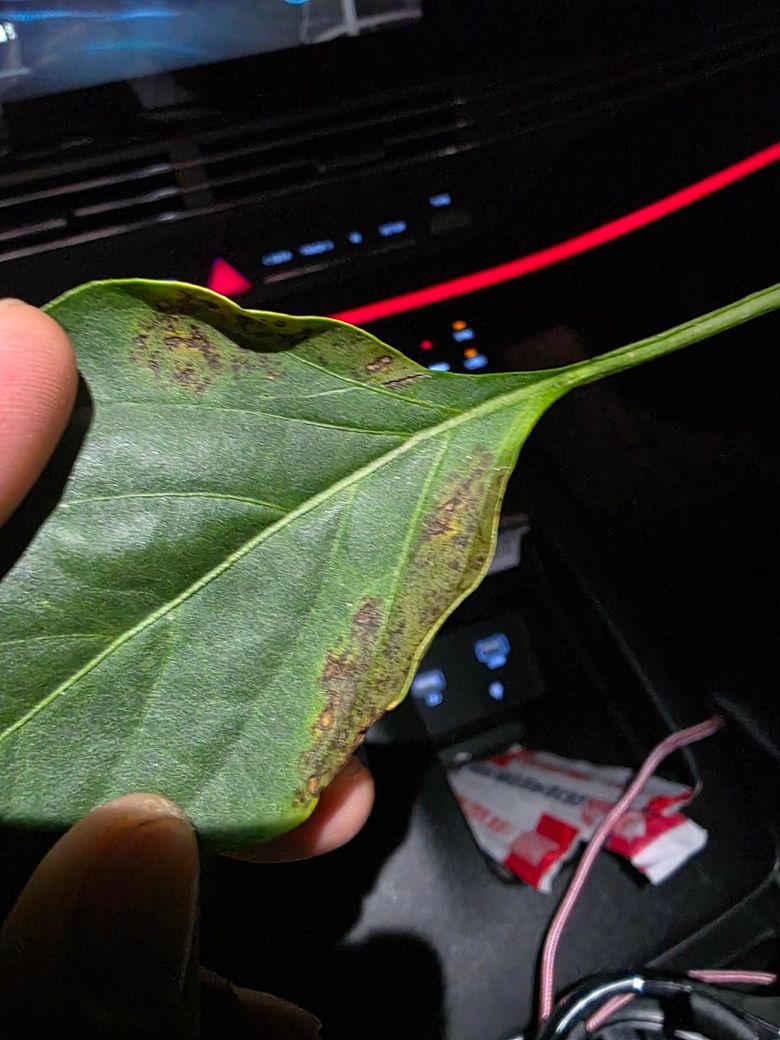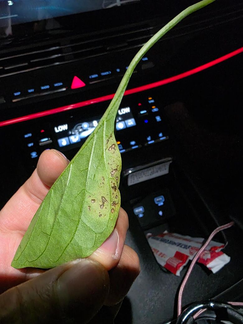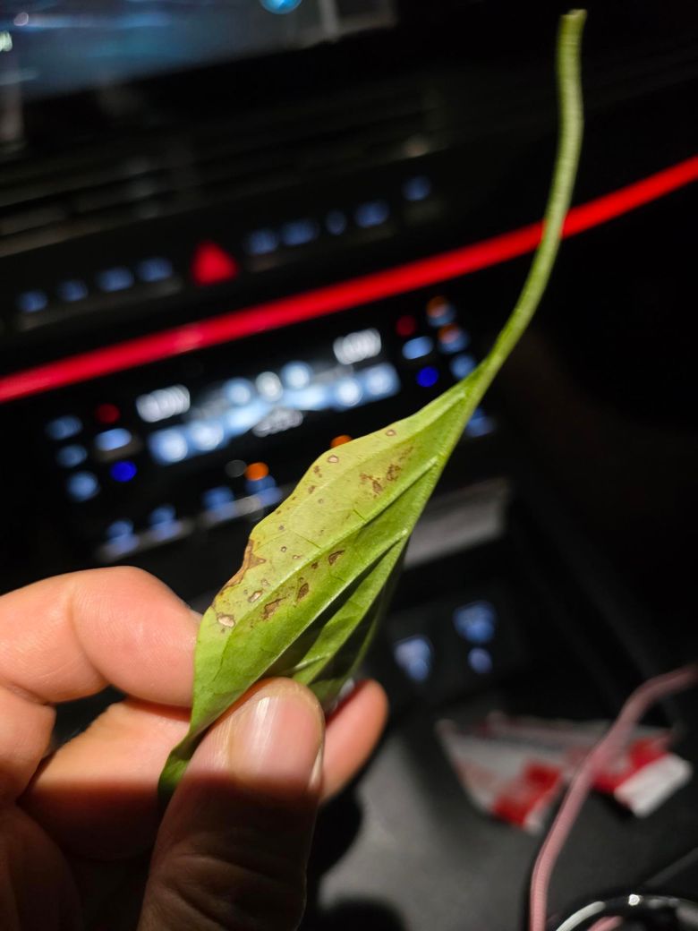사진을 보면 잎 표면에 불규칙한 은색 반점과 갈변된 흔적이 보입니다. 이는 총채벌레(Thrips)피해 가능성이 높습니다. 총채벌레는 잎을 흡즙해 표면이 얼룩지고 점점 마르는 증상을 유발하죠, 따라서 잎 뒷면까지 꼼꼼히 살충제를 살표하고 피해 잎은 제거해 확산 억제, 토양 및 잎 주변을 꺠끗이 유지하는게 핵심입니다.