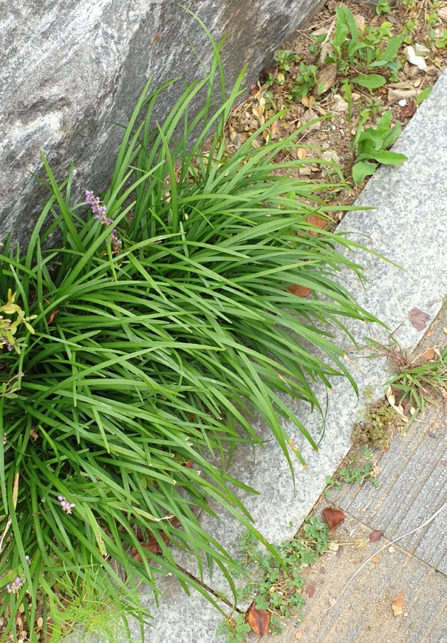 해당 사진으로 보아 '맥문동'이 아닌가 싶습니다. 한약재로도 쓰이는 식물로 잡초는 아니며, 오히려 몸의 이로운 작용을 하고 있는 식물입니다. 당뇨, 폐 등에 좋은 약초로 차로 끓여서 먹기도 한다고 합니다.