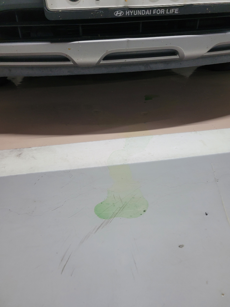 차를 타려고보니 바닥면에 초록색 물질이 흘러내려와 있는것을 발견했습니다.