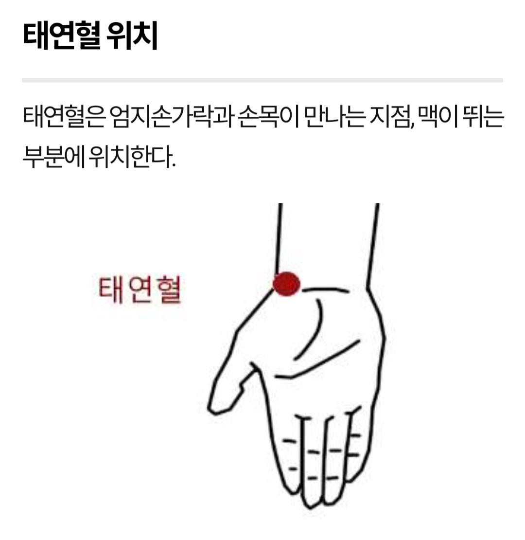 코를 막고 숨을 최대한 참으면서 버티다 못 버틸 때 심호흡을 크게 반복하면서 수태음 폐경의 태연혈 지압하면 효과가 있습니다