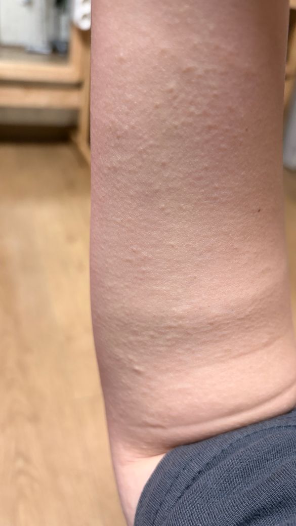 두드러기는 보통 경계가 비교적 뚜렷한 팽진이 갑자기 생겼다가 수 시간에서 하루 이내에 위치가 바뀌거나 사라지는 특징이 있고, 피부가 붉거나 부어오르는 경우가 많습니다. 현재 사진에서는 뚜렷한 팽진이나 발적 없이 잔잔한 오돌토돌한 질감 변화가 보이고, 간질거림만 동반되어 있습니다.