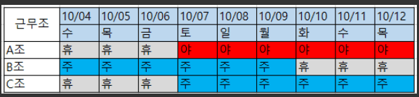 A조는 10/07~10/12일 + 휴무일(10/06 OR 10/12) 1일 포함한 7일이 1주임