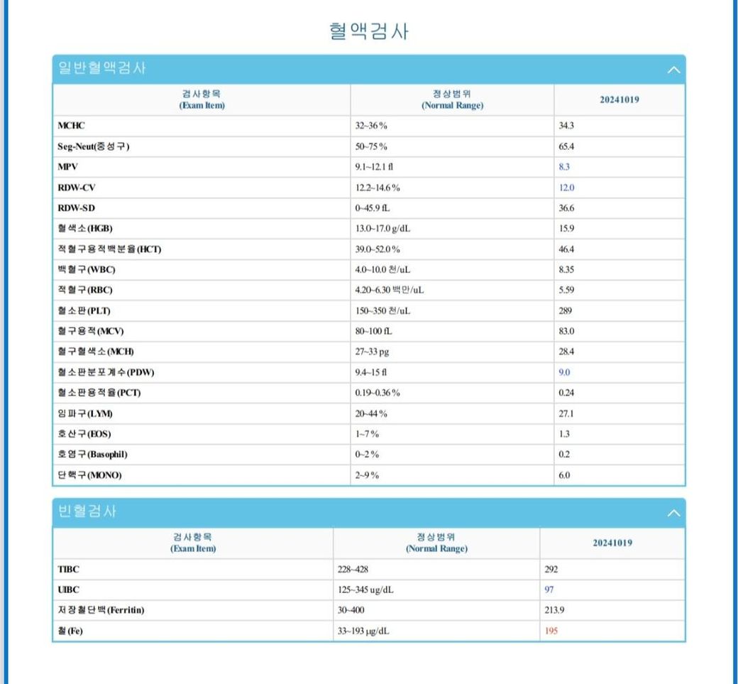 재생불량성 빈혈 가능성이 있다고 나와있나요? Hgb 이 15.9 니까 굳이 말하면 약간 높은편인데,, 빈혈이라는게 무슨 뜻인지 모르겠네요,, 빈혈이 아닙니다