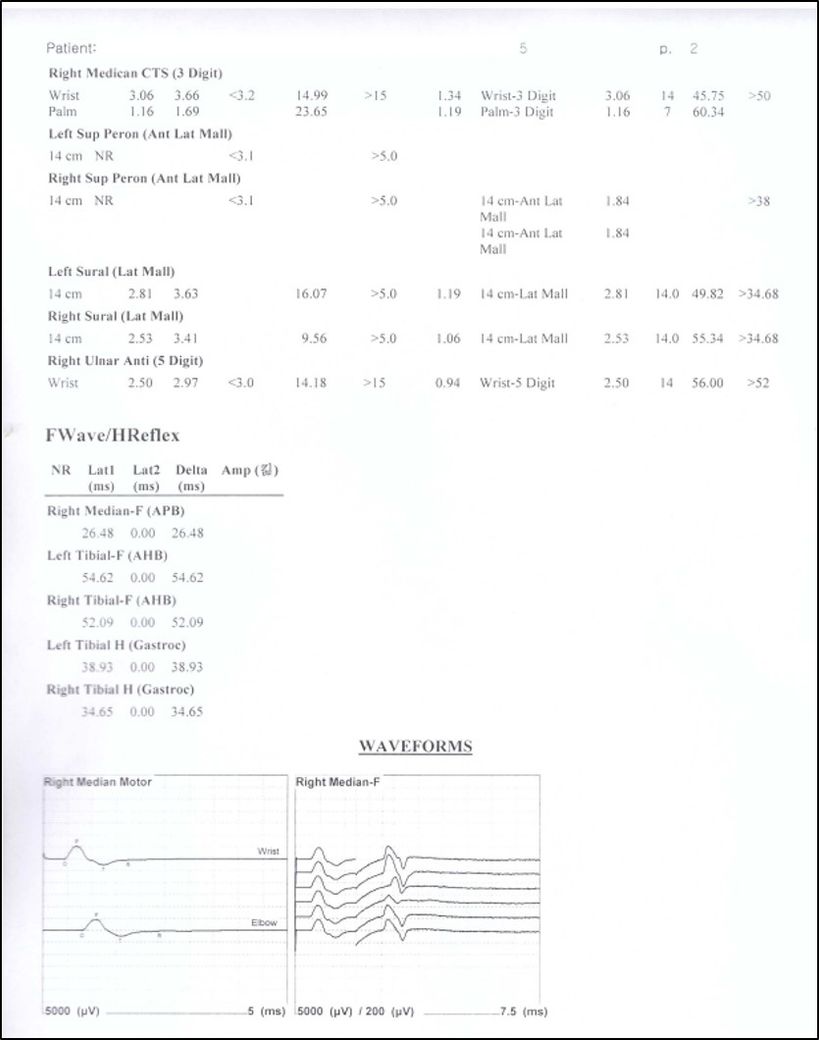 or 당뇨로 인한 말초 신경병증 이다? -> sural은 정상이라서 가능성이 높지 않습니다. // 다만 신경 전도 속도는 전반적으로 느려져 있어서 당뇨로 인한 말초 신경병증 여부는 검사한 주치의 선생님의 판단여하에 달려있겠습니다.