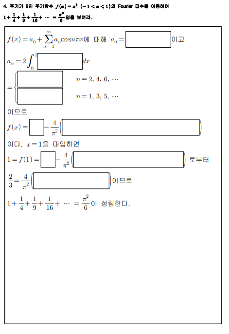 주기가 2인 주기함수에 대한 식을 Forier 급수를 이용하여 빈칸에 대한 답변을 작성하는 문제입니다. 빈칸에 대한 답변을 알고 싶은데 지식이 부족해 그러지 못하고 있습니다. 고견 알려주시면 배우겠습니다. 감사합니다.