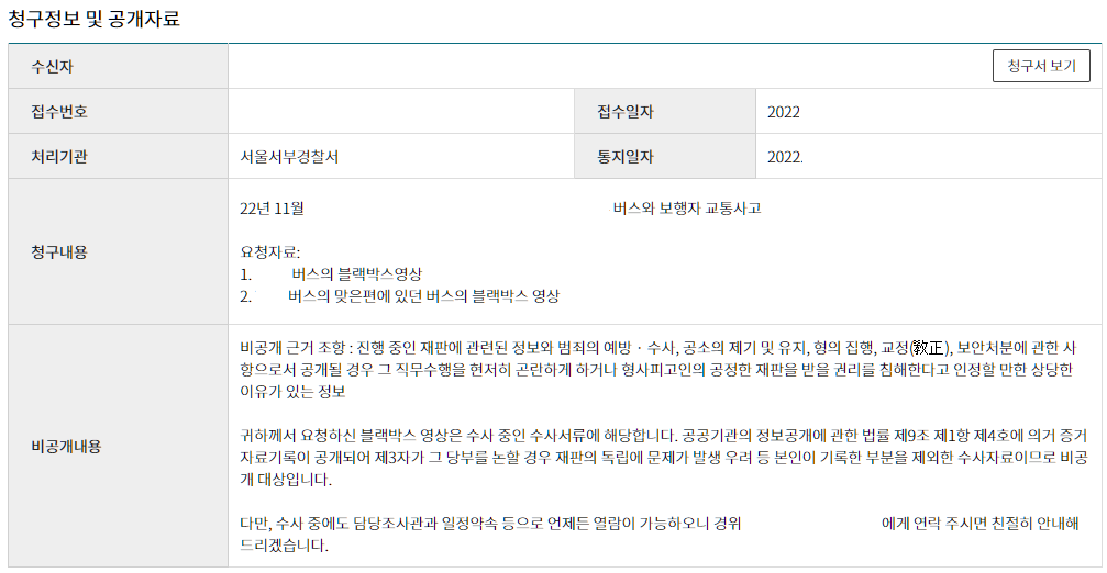 정보공개법 9조 1항 4호(교통사고) 비공개 대상에 포함되는지?