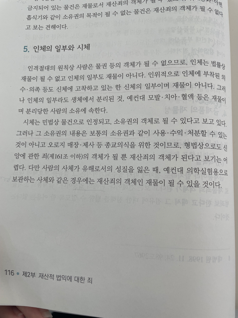 분리된 것을 말하는 것으로 실제 신체에서 일부를 훼손하는 행위 등은 상해 등으로 볼 수 있고, 분리된 신체에 대한 취급을 재물로 하는 것입니다. 개별 구체적인 사안별로 판단해보아야 합니다.