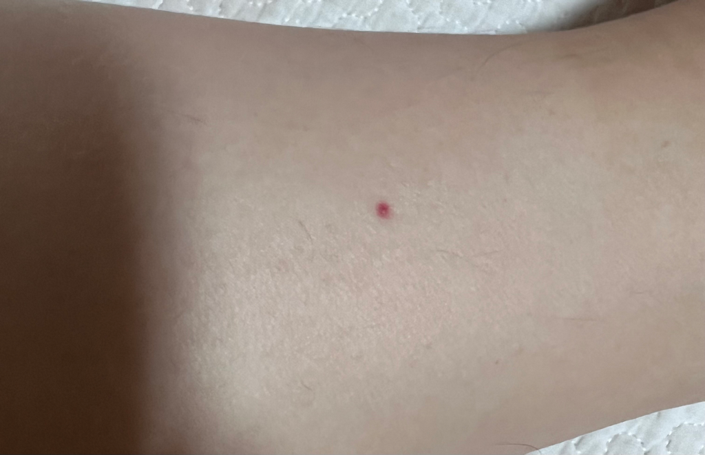 현재 질문자님의 병변으로 보아 미세혈관리 약간 터져서 나타난 작은 혈종으로 보이며 시간이 지나면 사차질 것으로 에측되어 우선은 증상이 없디면 경과관찰하셔도 무방할 것으로 사료됩니다.