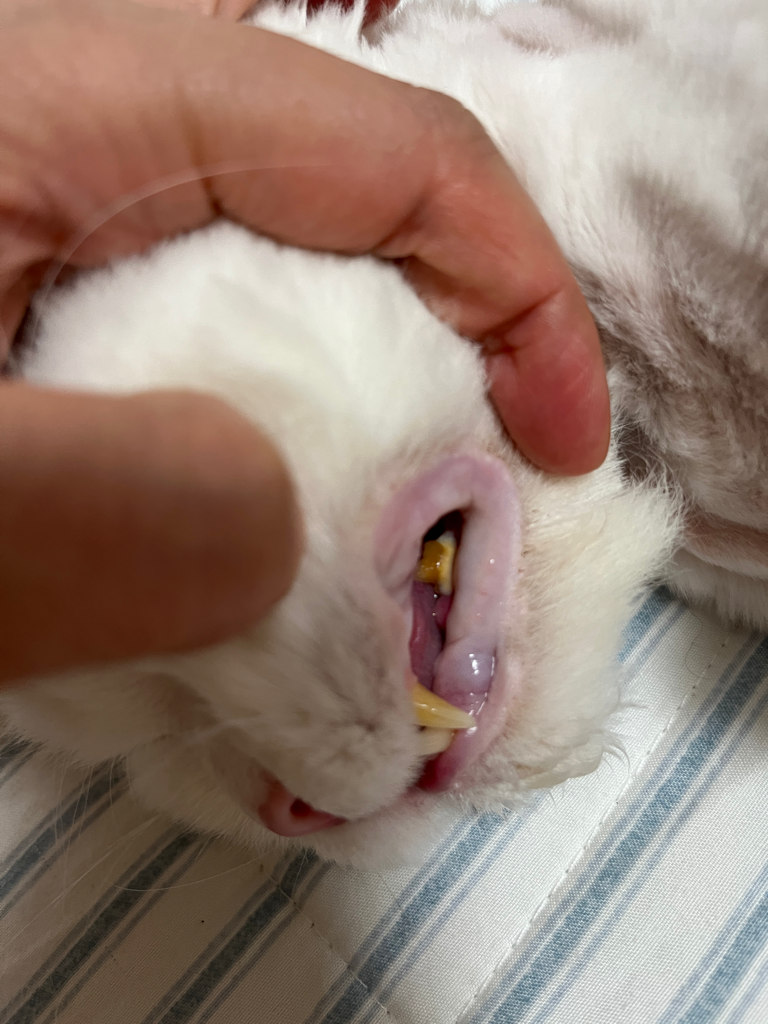 고양이는 작은 치석도 심각한 치주염을 의미하는 경우가 많아 육안 확인이 아닌 치과 방사선 촬영이 필요한 상태로 보입니다.