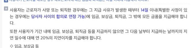 사용자와 근로자간에 합의하여 지급기한을 연장하더라도 퇴사 후 14일 이후부터는 근로자퇴직급여 보장법 및 동법 시행령에 따라 연 20%의 지연이자는 발생하게 됩니다.