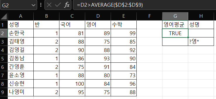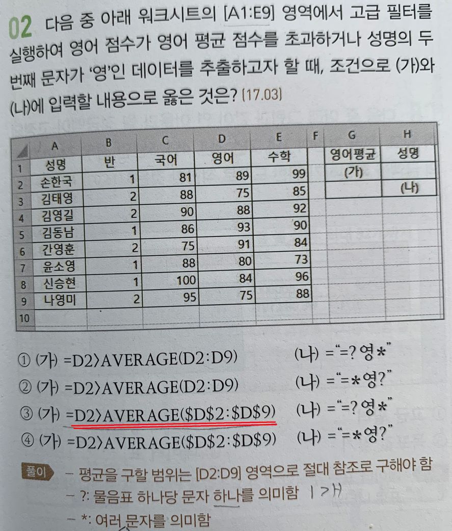 3번 빨간줄처럼 그대로 (가)의 위치에 입력했을 때 아래처럼 true 로 나옵니다.(그리고 저기 문제 객관식에 따옴표 위치가 맞는 건가요? ="?영*" 이렇게 입력 하는 게 맞는 것 같은데...아닌가요?)