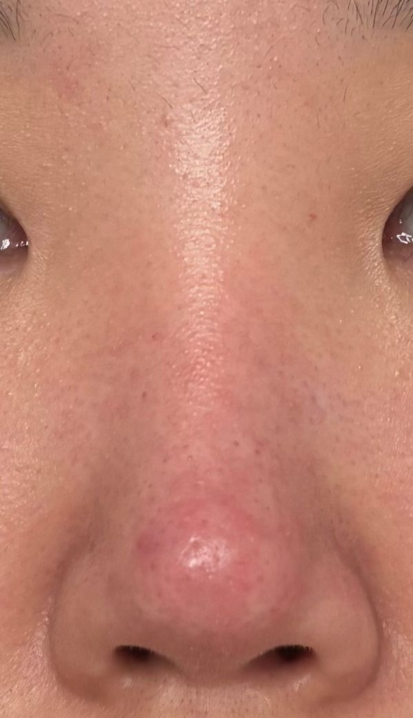 병태생리 측면에서 코끝은 피지선이 많고 혈류가 풍부해 외부 자극에 따른 혈관 확장과 홍반이 쉽게 나타납니다. 음주 후 일시적 혈관 확장으로 홍반이 시작되었고, 이후 반복적인 압출(핀셋 사용)로 모낭 주위 미세손상과 경미한 염증이 지속된 것으로 해석됩니다. 사진에서도 농양이나 피부 괴사 소견은 없고, 국소적 홍반과 약간의 피지성 변화 정도로 보입니다.