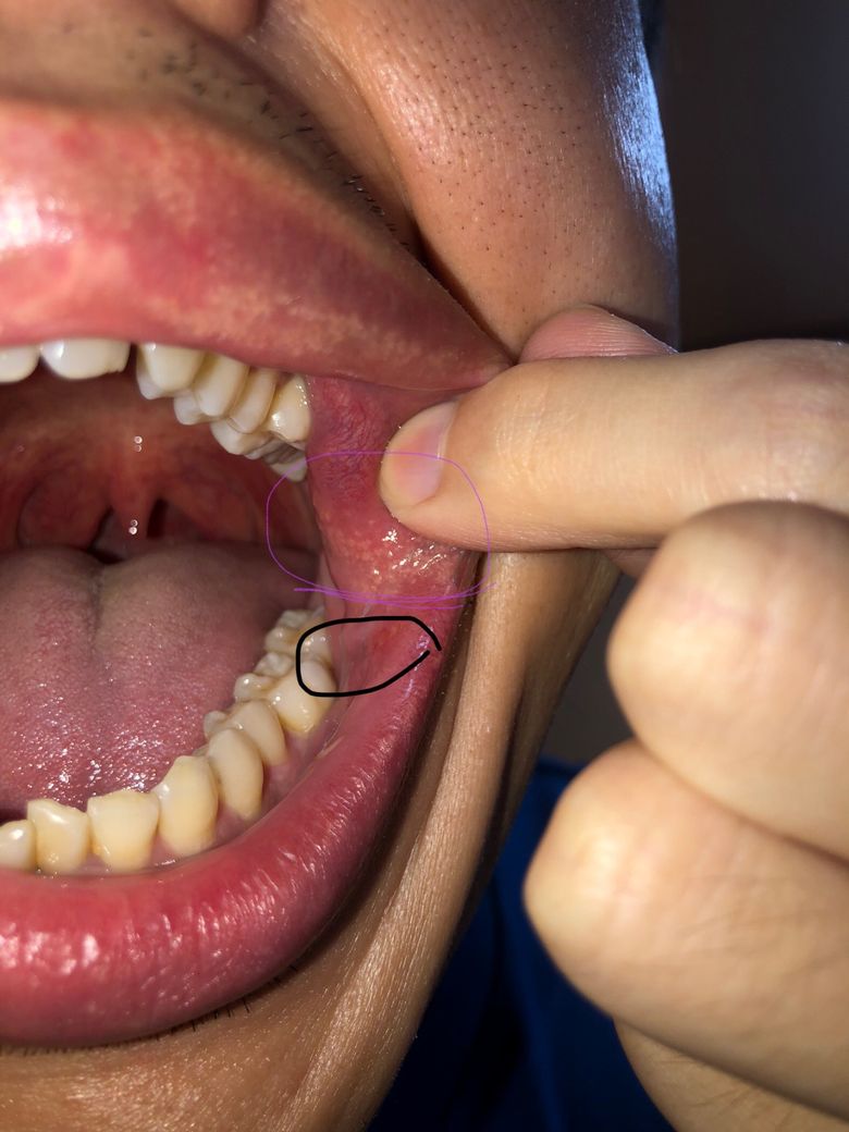 검정색 표시한 부분, 검정색과 보라색 사이에 흰색 동그란 구내염 보입니다. 오라메디나 페리덱스 둘 중 편하신 것으로 발라주세요. 구내염 자꾸 만지면 염증 심해지고 오래 갈 수 있어서 주의해주세요.