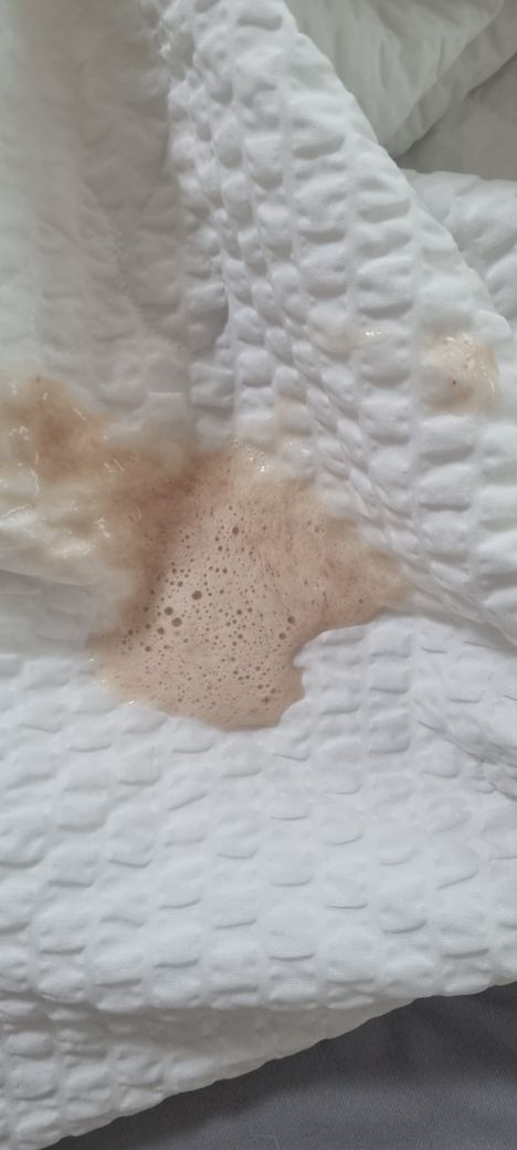 침대 옆에 같이 있다가 갑자기 이런 색깔의 토를 하는데 이유가 뭔가요..? 밥은 어제 저녁까지 먹고 오늘은 토만 2번 하고 안먹고 있습니다 병원에 데려 가는 게 좋을가요?