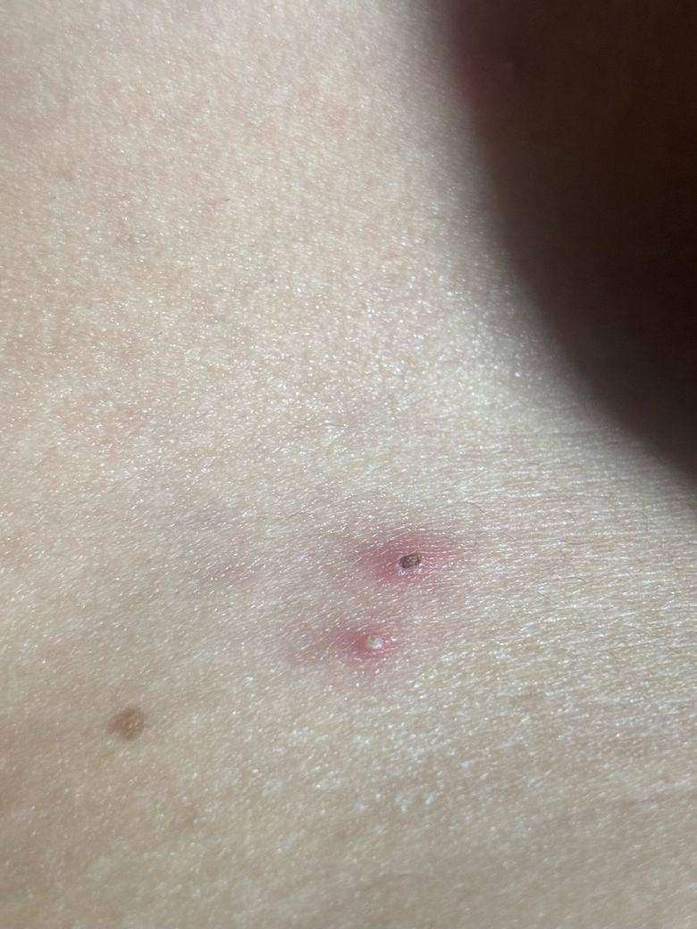 사진으로 보면 작은 모낭염(피부 속 털구멍 염증) 혹은 경미한 벌레물림 후 염증으로 보입니다. 중심이 붉게 올라오고 만지면 아픈 양상이 이에 가깝습니다.