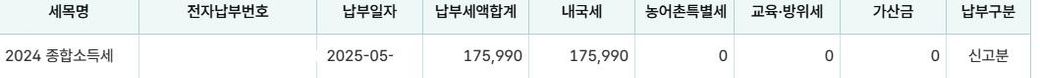 홈텍스를 통해 24년 귀속소득 최초 신고 시(25년 5월) 175,990원의 세액이 나왔고 납부를 했었습니다.