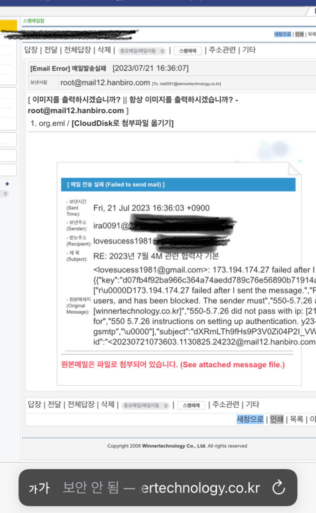스팸함에 있는 메일인거 같은데 메일주소가 스팸등으로 신고되거나 등록한건지도 확인이 필요하겠네요