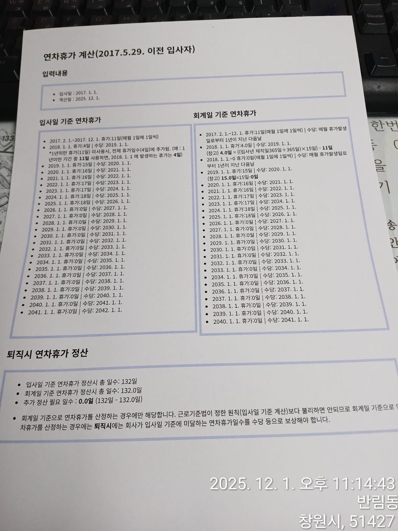 2017년1월1일 입사 연차 계정이 바꿔서 2025년1월1일 7회에 대한 연차를 받았습니다