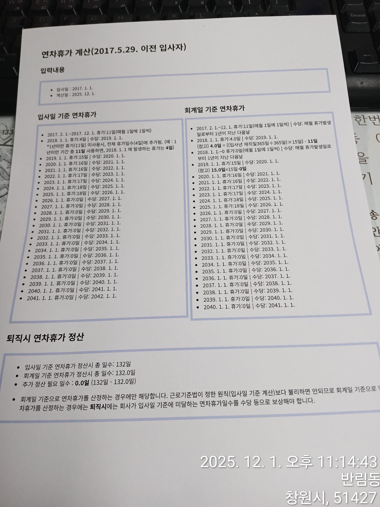 질문자님의 경우 25년 1월 1일까지 발생한 총 연차가 132개가 됩니다. 이후 25년 1월 2일부터 12월 31일까지