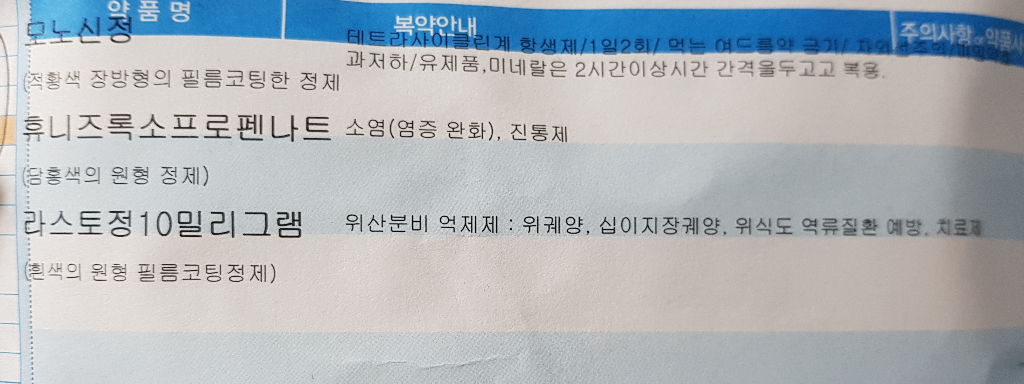 모노신정은 항생제, 휴니즈록소프로펜나트륨정은 소염진통제, 라스토정은 위장약이라서 알러지증상에 쓰는 약이 아니에요.