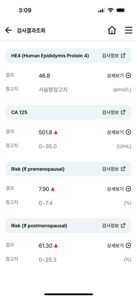 CEA 7.8 로 약간 이상하지만 CA125가 501.8로 매우 높습니다