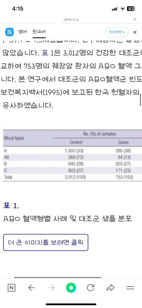 이러한 연구 결과들은 확실한 인과 관계를 제시하기보다는 통계적 상관관계를 탐색하는 데 그치는 경우가 많습니다. 귀하가 제시한 데이터에 따르면, 한국인의 경우 A형 혈액을 가진 사람들이 췌장암 환자 집단에서 일반 집단에 비해 상대적으로 높은 비율을 차지하는 것으로 보입니다. 이러한 통계는 특정 혈액형이 췌장암과 어떤 상관관계가 있을 수 있음을 시사하나, 이것이 직접적인 위험도 증가를 의미하는 것은 아닙니다.