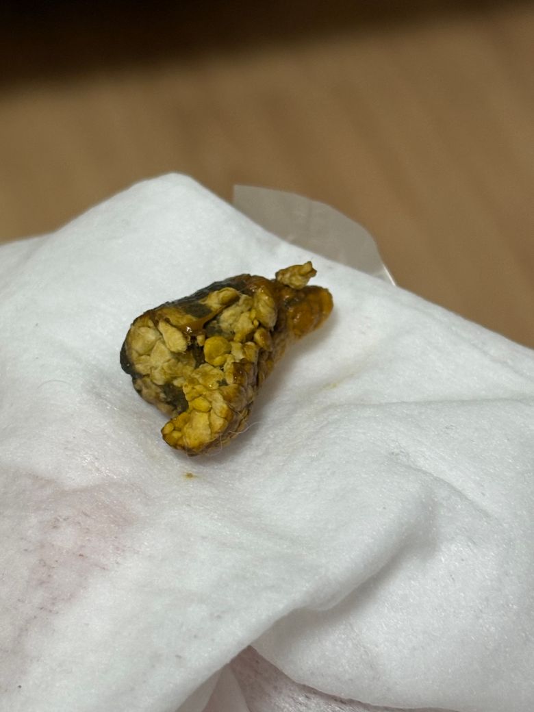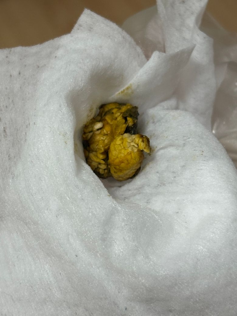 스티로폼과 같은 이물을 먹고 뭉쳐져 싸진 양상의 변으로 보입니다. 뭘 먹었는지 잘 고민해 보시고, 구토 등이 임상증상이 있으면 동물병원에 데려가서 진료 받으시기 바랍니다.