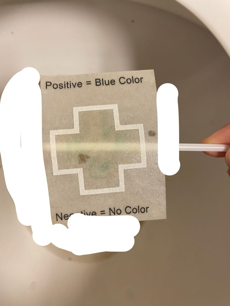전통적 구아이악 기반 분변잠혈검사(guaiac fecal occult blood test)는 대변 내 헤모글로빈의 peroxidase 유사 작용으로 청색으로 변하는 원리이며, 명확한 양성은 반응 부위가 뚜렷하고 분명한 청색으로 변합니다. 가장자리만 희미하게 변하는 경우는 위양성으로 보지 않는 경우가 많습니다.