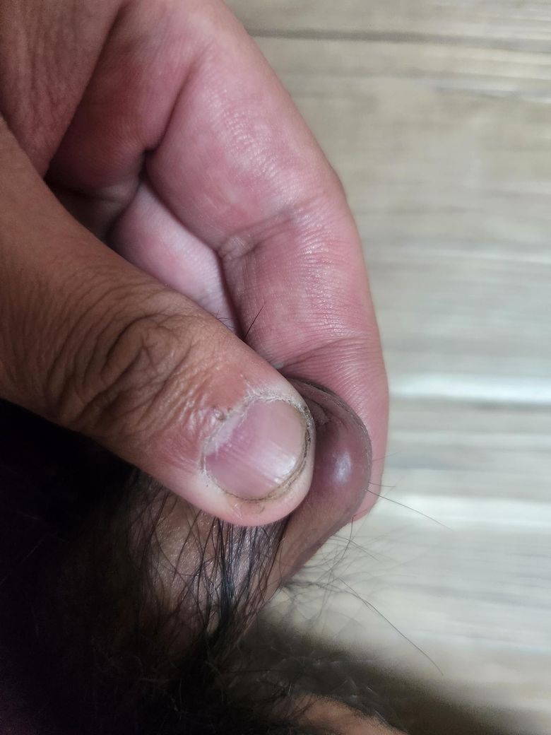 혹시 사진에서 보시면 이게 곤지름인가요? 아니면 모낭염인가요? 너무걱정이되서 질문해보니다 성기 껍질부분에 생겼습니다 아무통증 은없고 만지면 약간 혹같이 딱딱합니다 생기지는 2주정도 된것같습니다