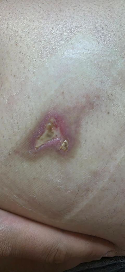 이런 경우 주사 부위 괴사 혹은 딱딱한 피하 덩어리(지방 괴사)나 만성 염증성 농양이 형성되었을 가능성이 있으며, 외과적 절개 배농 또는 조직 검사, 항생제 치료가 필요할 수 있어요. 병변이 접히는 부위에 있는 점을 고려하면 지속적 마찰과 습기로 인해 치유도 느려질 수 있구요.