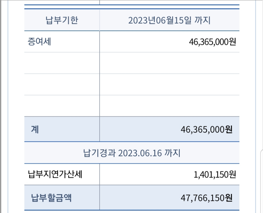 기준시가로 계산한 증여세는 21년도 12월에 납부를 하였고, 과소신고한 차액만큼을 23년도 6월 15일까지 납부하라는 고지서를 받았는데요