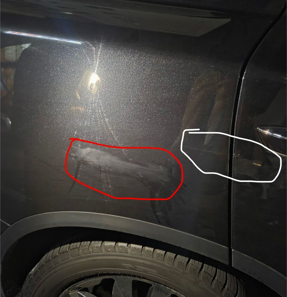상황인지하고 오른쪽으로 빼서 확인 후 차주분께 연락드리고 내려오셔서 빨간색 동그라미부분이 제가 일으킨 사고의 자국인걸 확인하고 보험처리해드리겠다 이야기 후 귀가하였습니다