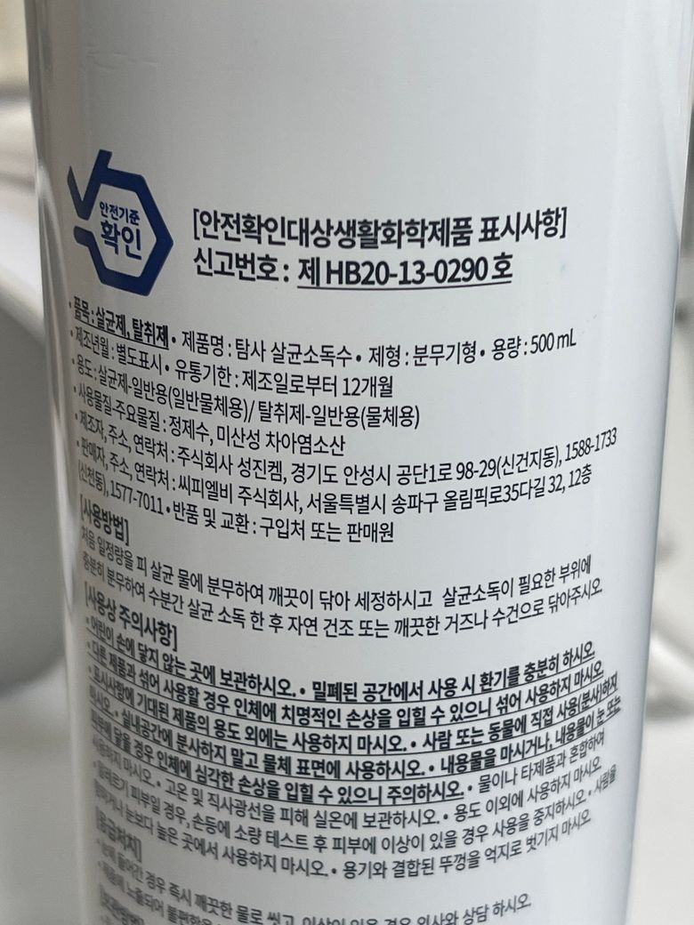 해당 소독제 성분은 흔히 락스에 들어있는 성분인 차아염소산으로 생각됩니다.