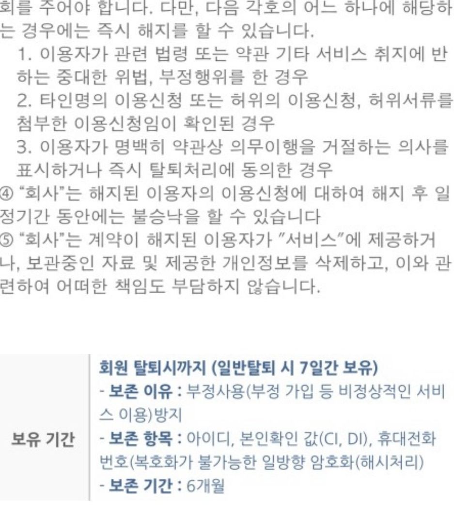 죽시 탈퇴시 아이디 CI,DI 암호화된 전화번호 이 세가지 말고는 다 즉시 파기라고 하는거 같습니다