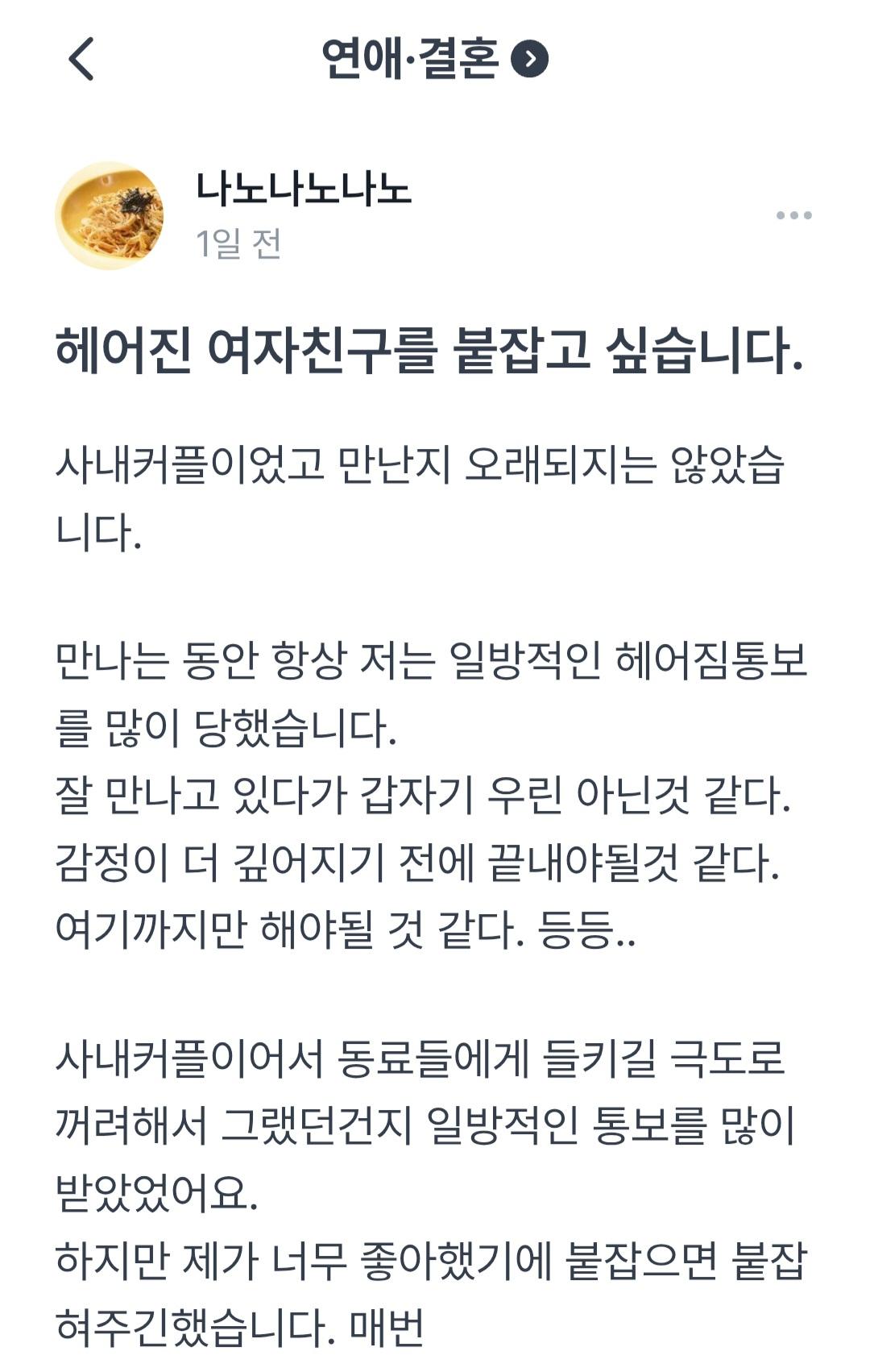이미 파혼 한 친구를 길에서 만나면 초라해 보입니다. 쿨하지 않다면 상대방과 법적으로 해결할수있습ㄴ다. 돌싱인 전 다시 만날 생각은 없으나 서로 미련이 남으면 상대커플