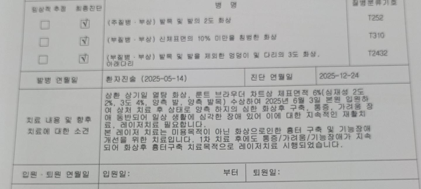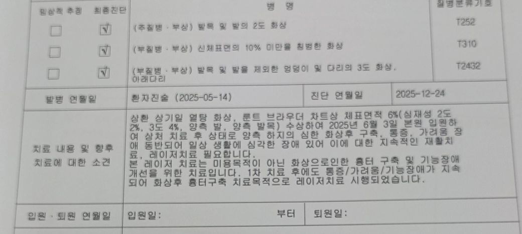 화상으로 인한 피부이식 후 레이져치료는 장기간 치료시 보험금 지급을 거부하는 경우가 많습니다.