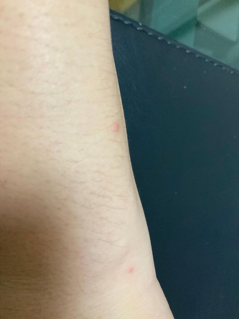 사진으로 보이는 붉은 반점은 작은 구진(붉은 솟음) 형태로, 경미한 염증이나 알레르기 반응에서 흔히 보이는 모습입니다.