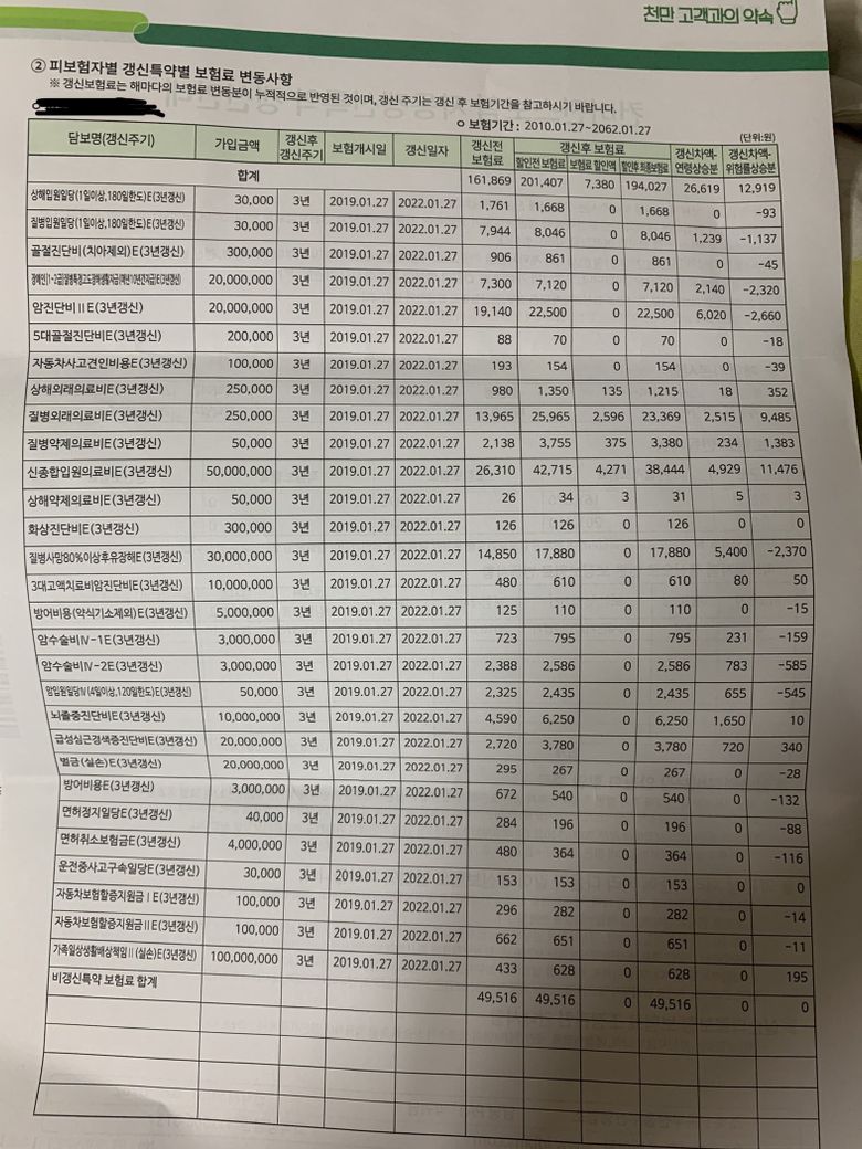 1. 현재 2개 보험 주요 진단비에 갱신형 특약 등이 많아