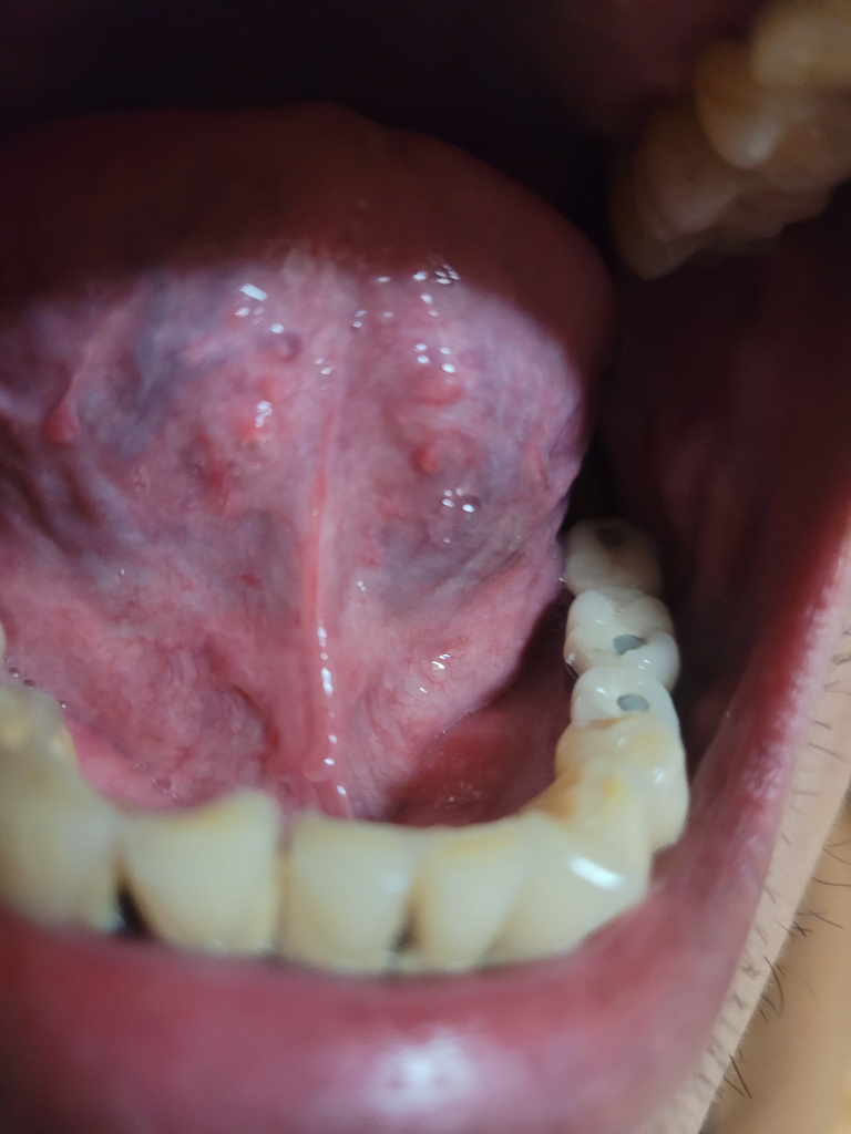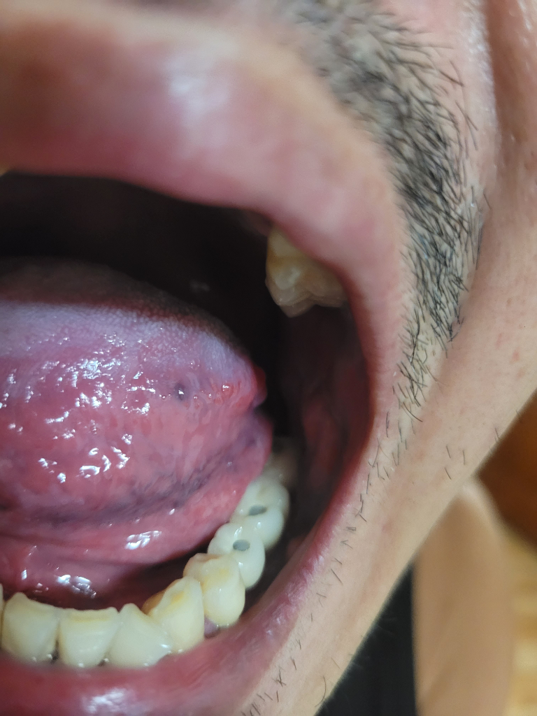혀의 아래에 보이는 어두운색은 정맥혈관이 있어서 정맥혈이 비춰보이는 것이기 때문에 큰 문제는 아닙니다.