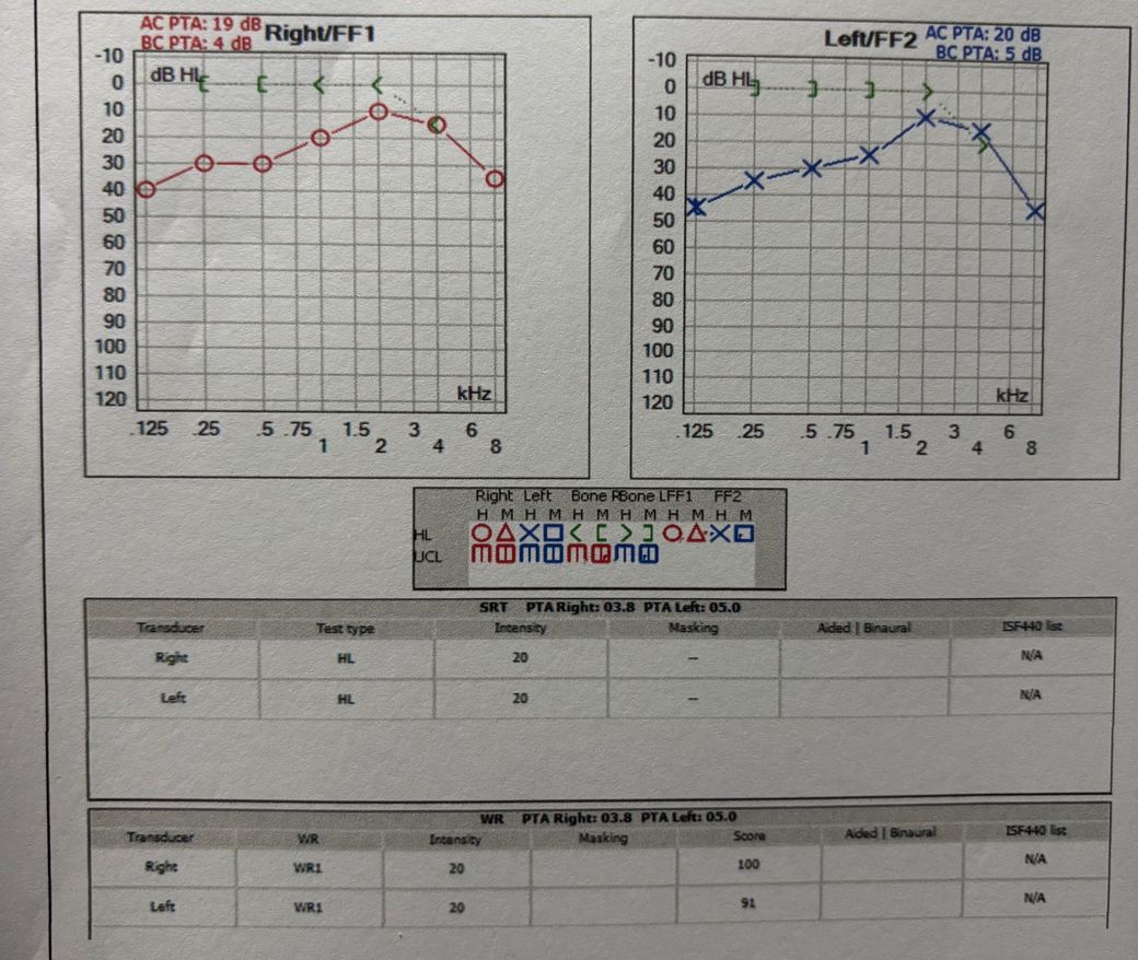 첨부된 청력검사 결과를 보면 저주파 영역(125Hz에서 500Hz 구간)에서 약 30에서 45 dB 정도의 청력 저하가 보이고, 중고주파(1 kHz 이상)는 비교적 정상 범위에 가깝습니다. 양측 모두 비슷한 양상이지만 좌측이 약간 더 떨어져 있으며, 평균 청력은 우측 약 19 dB, 좌측 약 20 dB 수준으로 표시되어 있습니다. 골전도와 기도 차이가 거의 없어 전음성 난청보다는 감각신경성 난청 형태로 보입니다. 이런 패턴은 저주파형 돌발성 난청에서 흔히 관찰됩니다.