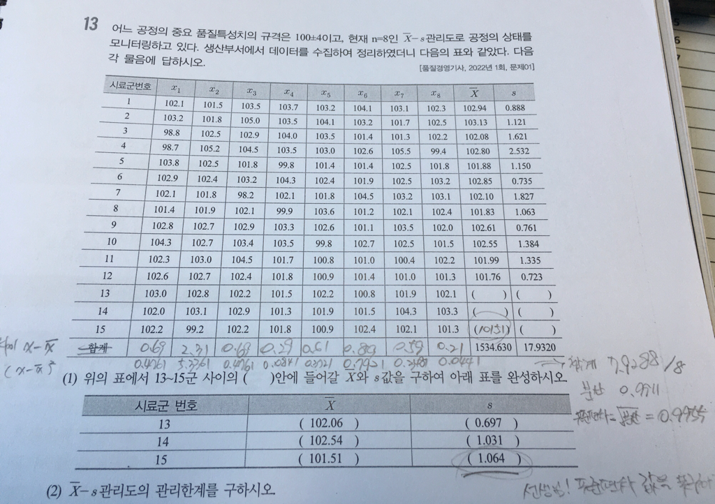 X-s 관리도 관련된 문제인데요 제가 계산했을때는 표준편차 0.9911 이 나오는데 ( 시료군15항목 평균값 101.51) 답지에는 1.064가 나오네요