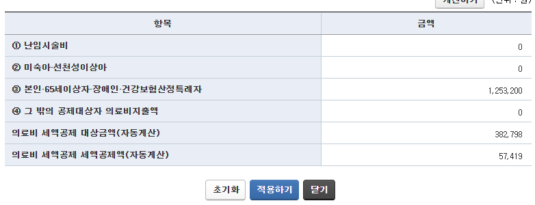 연말정산 의료비 세부사항에는 세액공제액이 뜨는데 적용이되어 있지 않습니다