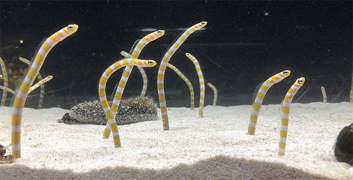 주로 산호초 주변 모래바닥에 굴을 파고, 머리만 내밀고 바다 물살에 몸을 흔들며 사는 독특한 바닷물고기로, 아쿠아리움에서는 '줄무늬 장어 무리'로 많이 소개되는 종이지요.