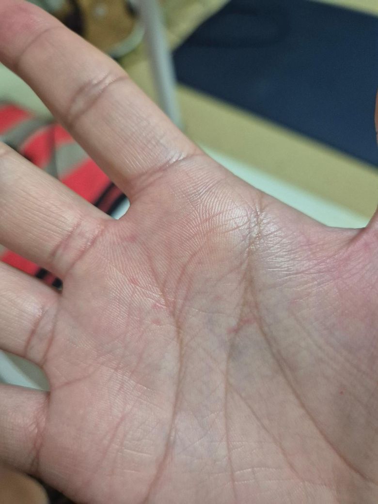 아래 두 사진은 무릎 옆쪽 사진과 손바닥 사진입니다만, 손바닥은 하룻밤만에 없어졌습니다.