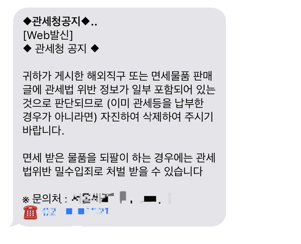 요즘에 해외직구 물품도 관세를 내야 통관이되지요. 문자가 온데로 관세를 납부하셨으므로 중고로 팔아도 됩니다. 관세를 납부하고 수령했으므로 그후 내국물품이되고 이후 중고판매는 정당한소유권행사라고 할수 있습니다. 문자내용은 일률적으로 주의환기차원의 문자로 보여지니 질문자는 신경안쓰셔도 될듯합니다.