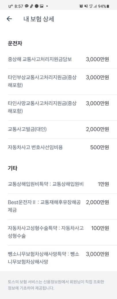 기존 가입하고 있는 교통사고처리지원금은 3천만원 특약 보험료나