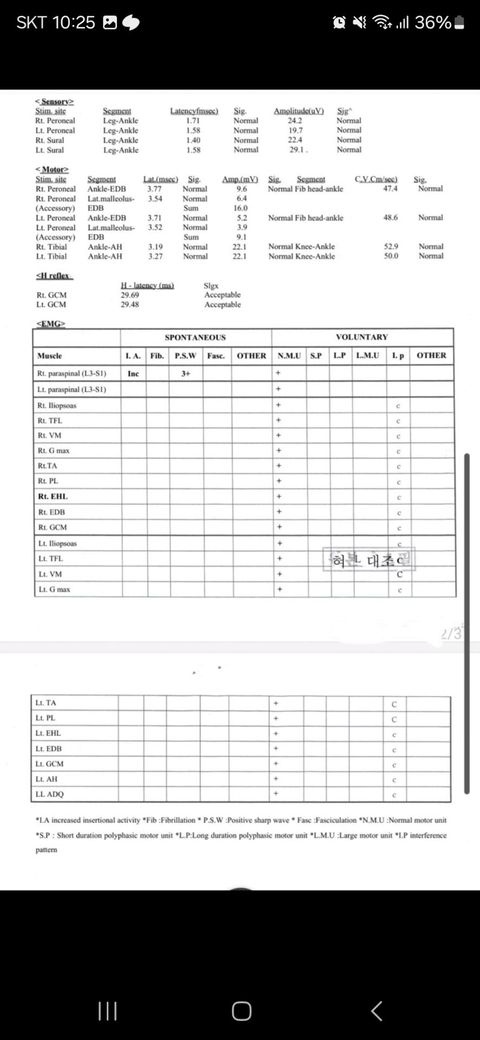 지금 보여주신 기록지 상에는 Rt (우측) paraspinalis (허리근육)에서 P.S.W (positive sharp wave)가 확인됩니다.