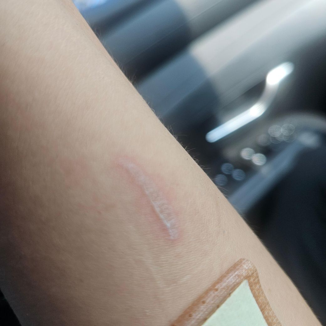 뜨거운 것에 데여서 곧바로 찬물에 좀 씻기고 나오덤크림 및 밴드 부착했습니다