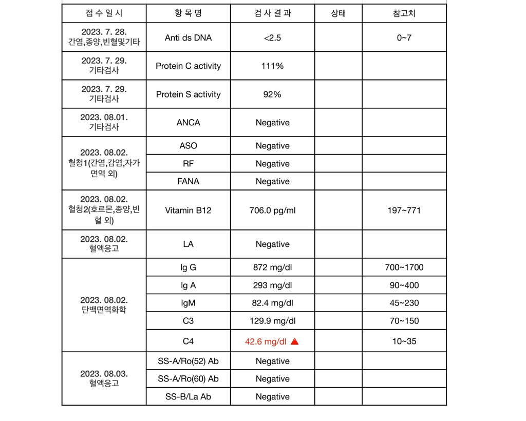 자가면역 관련 검사, 체내 비타민 농도 검사로 보입니다. 검사상 큰 특이소견은 없어 보이나, 주치의 선생님에게 정확한 설명을 들으시는 것이 좋습니다.