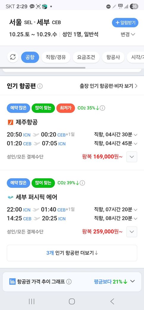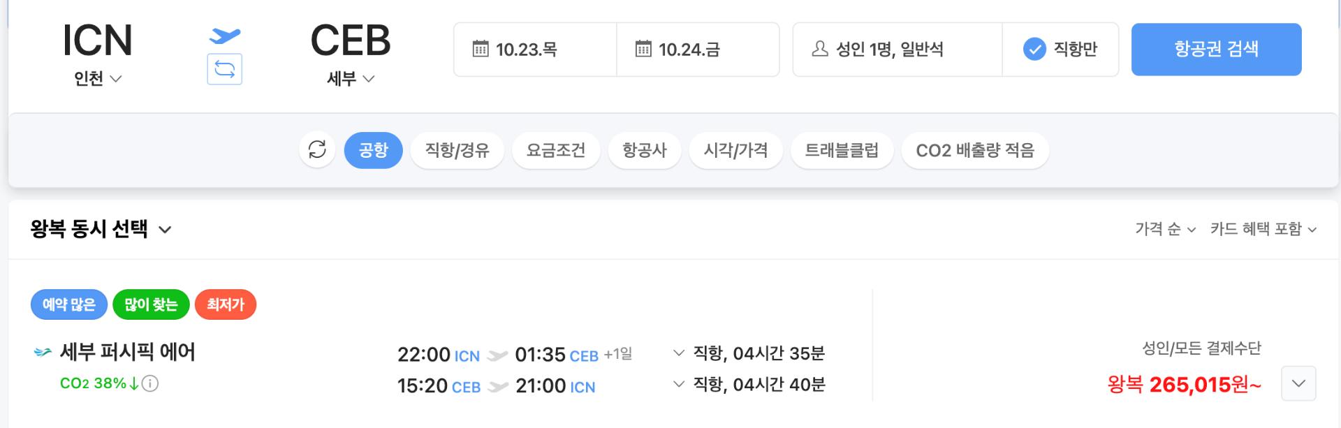 아래 세부 퍼시픽 에어는 직항이 아닌